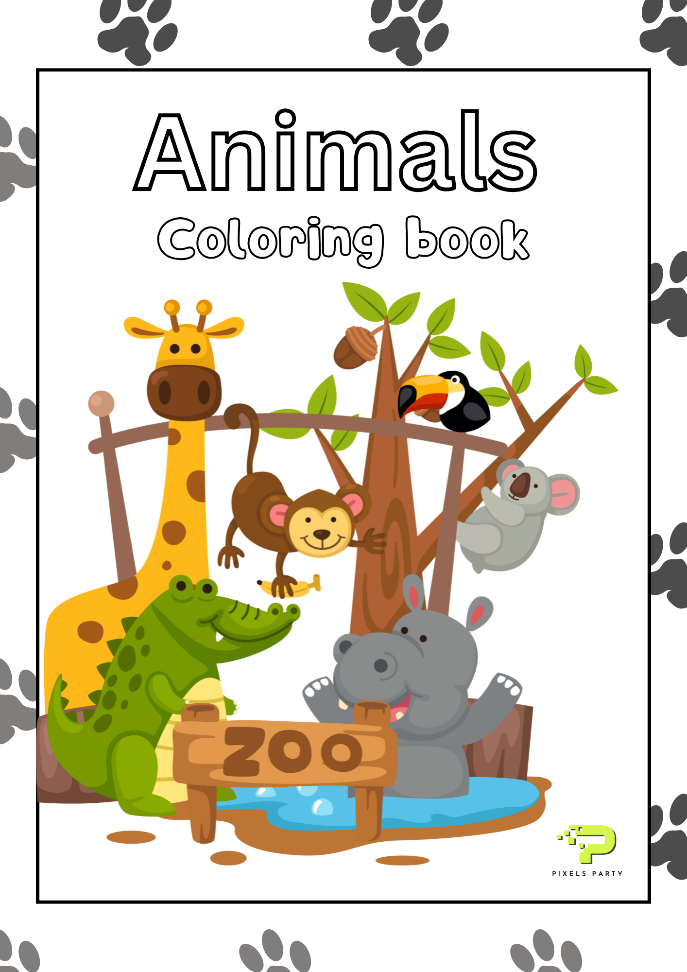 20 صفحة تلوين برسومات حيوانات محببة (أسد، زرافة، فيل،نمر،…).